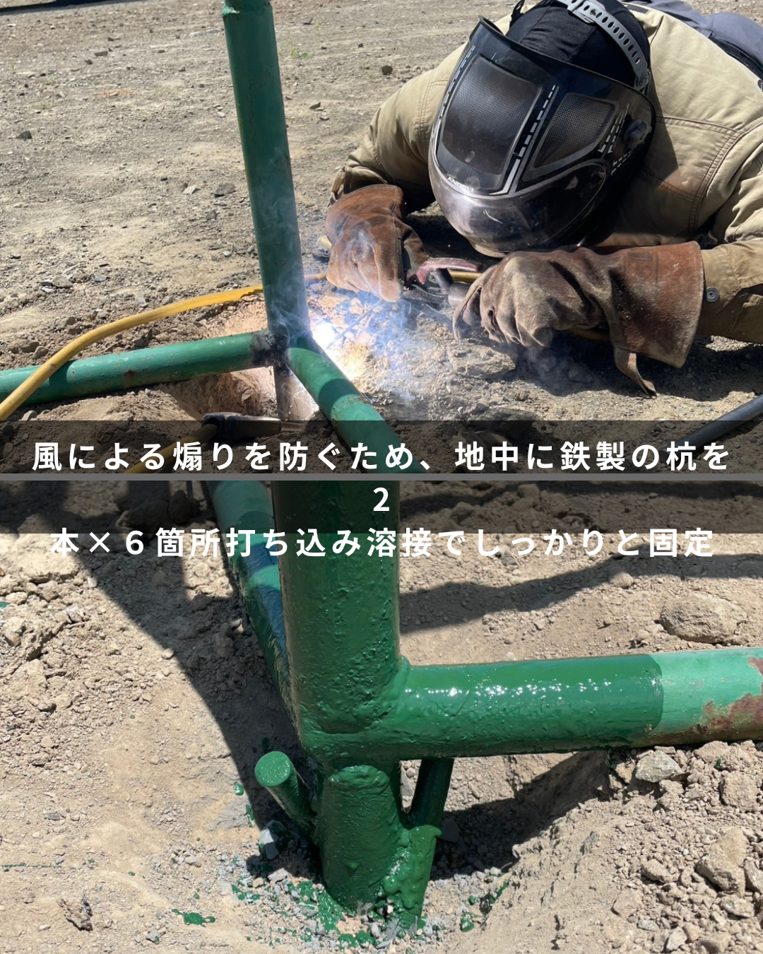 さらに風による煽りを防ぐため、地中に鉄製の杭を2本打ち込み、