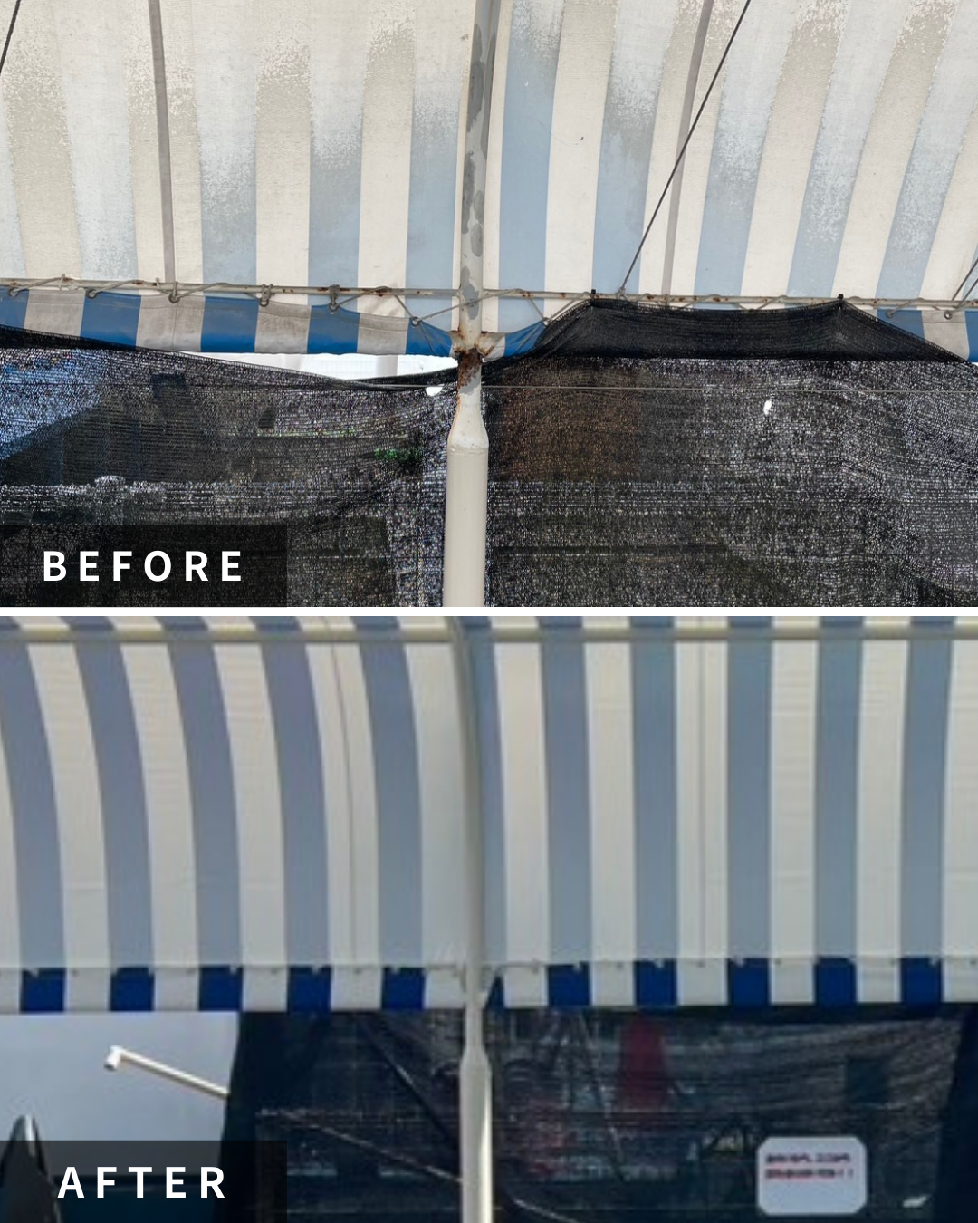 また、テントの鉄骨フレームも塗装をし直し、全体的に清潔感のある印象へ。 屋根だけでなく構造部分まで丁寧にメンテナンスすることで、安全性を保ちながら長く快適にご利用いただけるよう仕上げています。