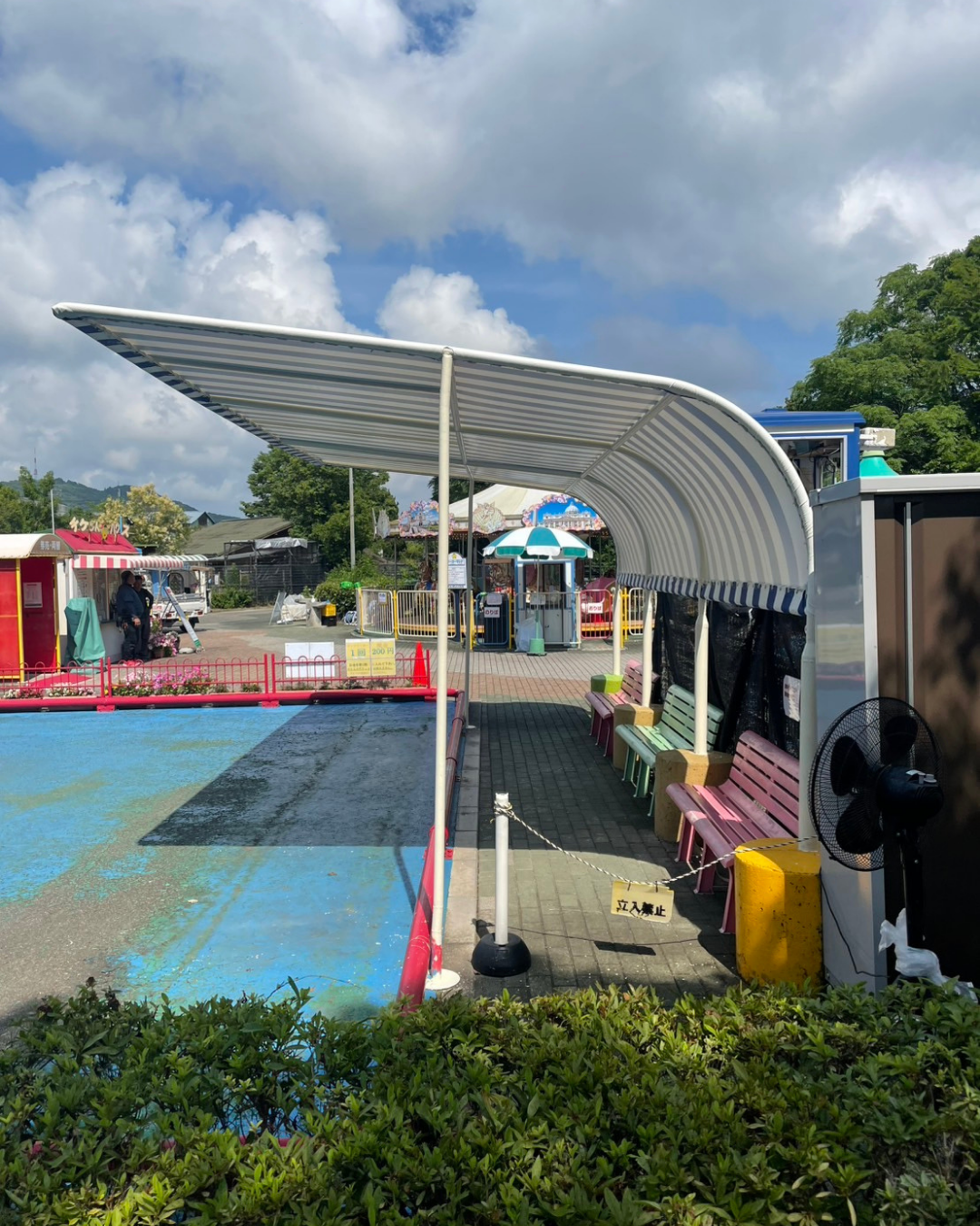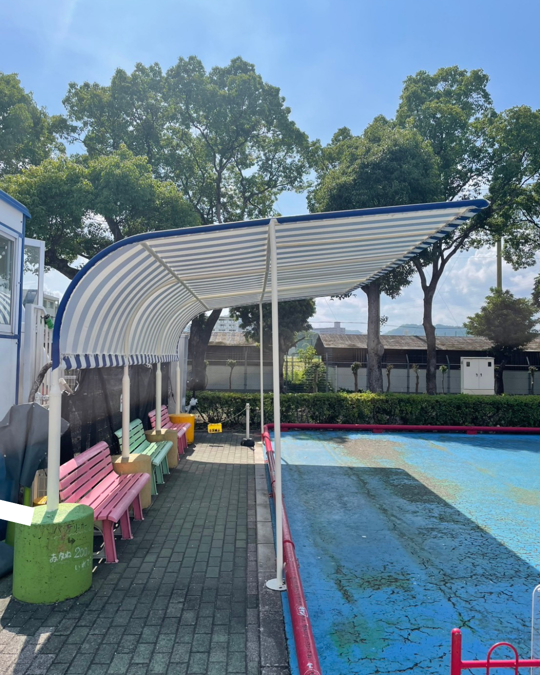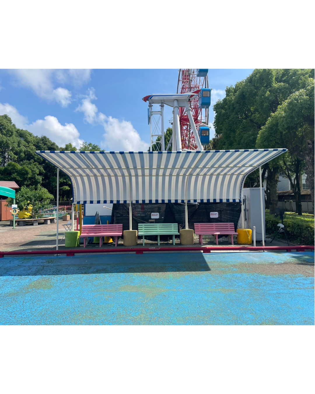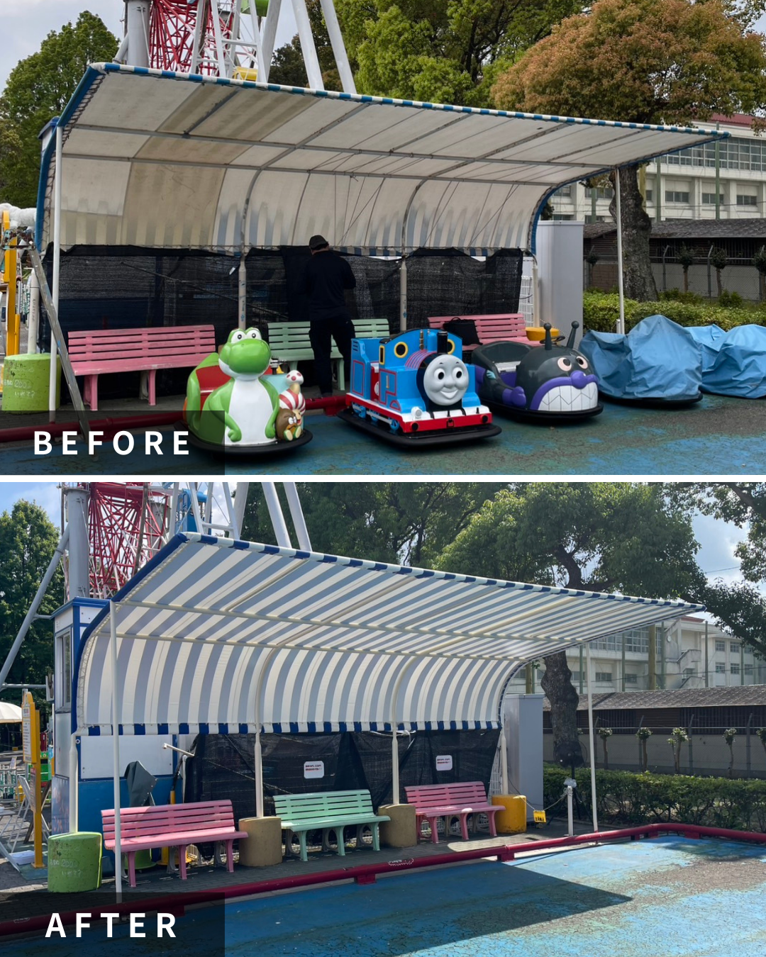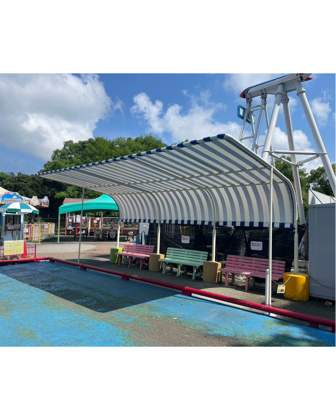 「わんぱーくこうち」のバッテリーカー乗り場に設置されている固定式テントを張り替えました。 長年の使用で褪色してしまったテント生地を新しく交換し、青白ストライプの爽やかなデザインにリニューアル。 お子さま連れのご家族が集まる遊び場にふさわしい、明るく楽しい雰囲気になりました。